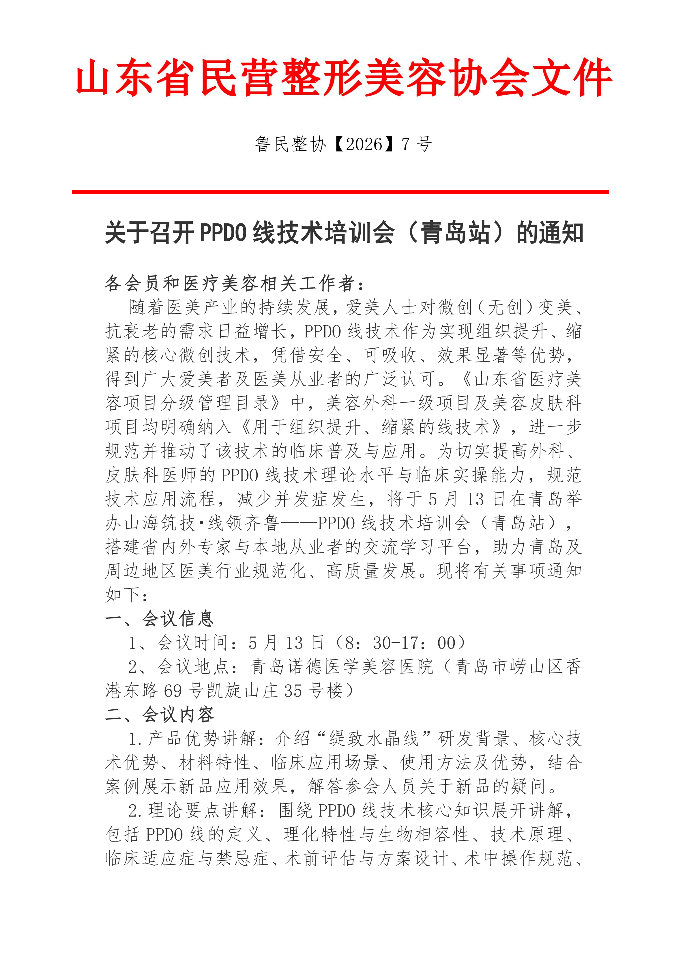 随着医美产业的持续发展,爱美人士对微创(无创)变美、抗衰老的需求日益增长,PPDO线技术作为实现组织提升、缩紧的核心微创技术,凭借安全、可吸收、效果显著等优势,得到广大爱美者及医美从业者的广泛认可。《山东省医疗美容项目分级管理目录》中,美容外科一级项目及美容皮肤科项目均明确纳入《用于组织提升、缩紧的线技术》,进一步规范并推动了该技术的临床普及与应用。为切实提高外科、皮肤科医师的PPDO线技术理论水平与临床实操能力,规范技术应用流程,减少并发症发生,将于5月13日在青岛举办山海筑技・线领齐鲁——PPDO线技术培训会(青岛站),搭建省内外专家与本地从业者的交流学习平台,助力青岛及周边地区医美行业规范化、高质量发展。现将有关事项通知如下: