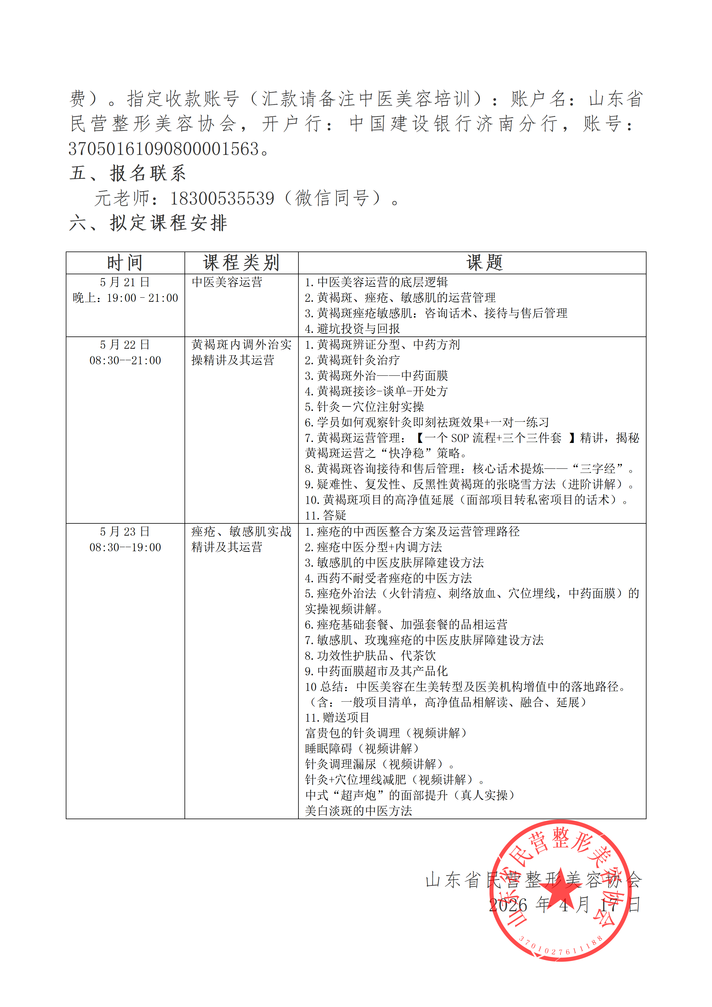 培训费用:8800元/人(前十名8000元/人,双人同行团购6800元/人,三人同行团购5800元/人)(含讲义费,免费复训,不含差旅费)。指定收款账号(汇款请备注中医美容培训):账户名:山东省民营整形美容协会,开户行:中国建设银行济南分行,账号:37050161090800001563。